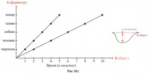 Представим себе, как представляли наши Предки образ Времени, как образ реки. Соответственно если смотреть на разрез реки (рис. 1) самая высокая скорость на фарватере. Те частицы, которые находятся в центре проходят реку гораздо быстрее, чем те, которые у берега. Создадим образную проекцию (рис. 1): на оси ординат уровень фарватера, абсцисс - Время (какая-то исходная точка Времени). Здесь же на оси абсцисс находятся несколько структур: черепаха, человек, собака, хомяк, комар. Проходит какой-то определенный отрезок Времени, Время течёт согласно течению "реки Времени". Допустим за основу у нас взята 1 мин.: