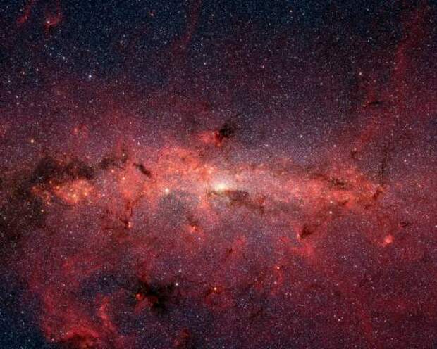 К счастью, у астрономов есть дополнительные длины волн, с помощью которых можно заглянуть внутрь галактики. Когда вы взглянете на ядро галактики в инфракрасном спектре, вроде космического телескопа Спитцер, она будет выглядеть примерно так.
