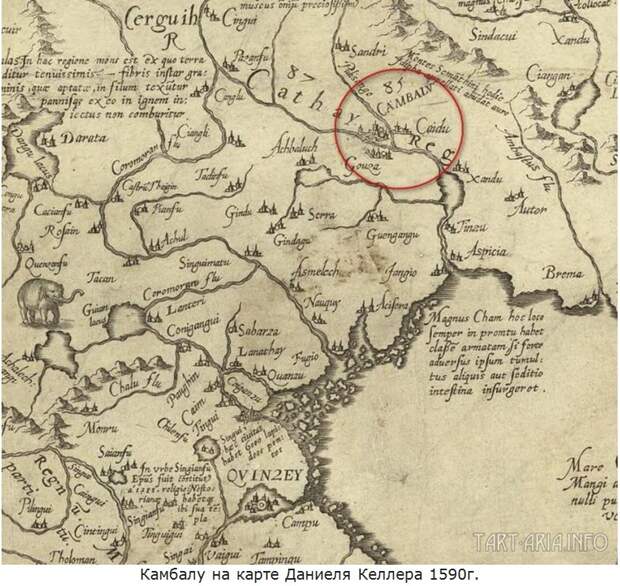 Пунктиром я обозначил, сухие ныне русла притоков реки Охота. На карте 1590 года они полноводные, потому-то Камбалу и был морским портом, хоть и находился достаточно далеко от побережья. Сейчас Охота сильно обмелела, но эти сухие русла по-прежнему существуют. Они очень хорошо прорисованы на современной карте, и благодаря им мне удалось установить точное местонахождение легендарной Столицы Великой Тартарии Камбалу. Сравните теперь эту карту со следующим фрагментом.