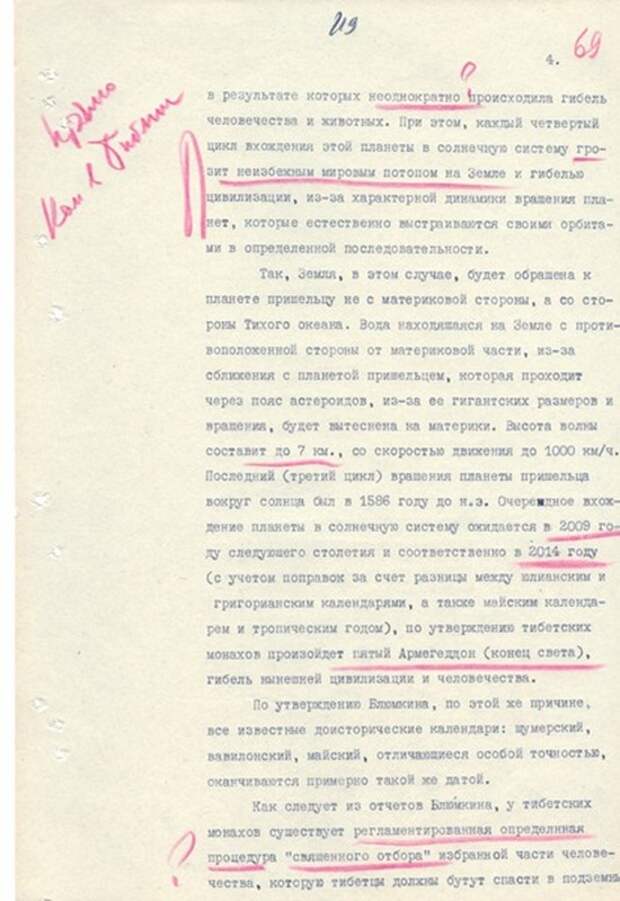 Правда, номер и шапка документа были заретушированы, поэтому определить, секретный документ или нет, кем и когда он составлен, было невозможно. В то же время непосредственно сам текст записки был виден достаточно отчетливо и вызывал определенный интерес, ведь в нем говорилось о том, что монахи Тибета якобы рассказали экспедиции, состоящей из сотрудников ОГПУ, о конце света, который действительно произойдет, но в 2014 году.